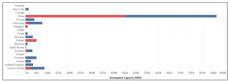 圖16. 計(jì)劃建設(shè)(藍(lán)色)或在建(紅色)的鋰離子電池制造工廠生產(chǎn)能力