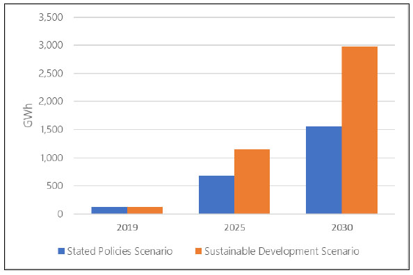 圖14. 根據(jù)國(guó)際能源署(IEA)STEPS情景下,在xEV行業(yè)中預(yù)計(jì)的全球年度鋰離子電池部署量