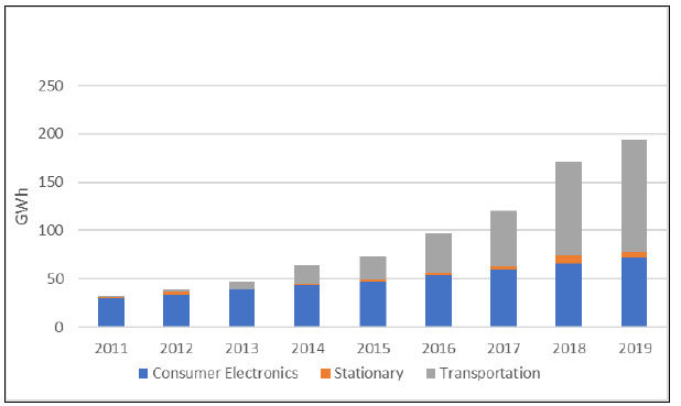 鋰離子電池市場(chǎng)是增長(zhǎng)最快的可充電電池市場(chǎng)。從2013年至2018年,鋰離子電池在所有市場(chǎng)的全球銷售額增長(zhǎng)了一倍以上。交通運(yùn)輸行業(yè)在鋰離子電池市場(chǎng)上占主導(dǎo)地位,也是增長(zhǎng)最快的行業(yè),各種汽車采用了60%的鋰離子電池。根據(jù)Avicenne公司發(fā)布的調(diào)查報(bào)告,全球鋰離子電池市場(chǎng)規(guī)模在2018年為400億美元,如圖9所示,這相當(dāng)于在全球部署172GWh的電池儲(chǔ)能系統(tǒng),到2019年增至195GWh。