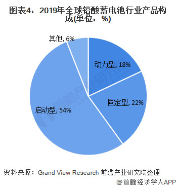 從產(chǎn)品構(gòu)成來看,目前全球鉛酸蓄電池中,啟動型鉛酸蓄電池占比最大,根據(jù)Grand View Research公布的數(shù)據(jù)顯示,2019年全球啟動型鉛酸蓄電池市場規(guī)模占比達(dá)54%,固定型鉛酸蓄電池規(guī)模占比為22%,動力型鉛酸蓄電池規(guī)模占比為18%。