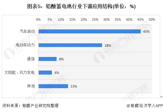 汽車起動領(lǐng)域?qū)︺U蓄電池的需求占比最大,需求占比達(dá)45%
