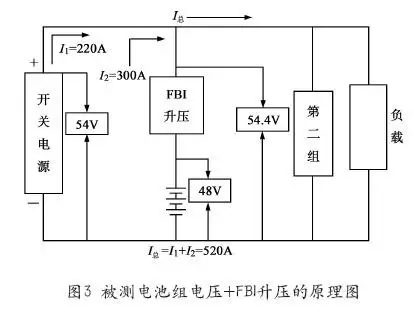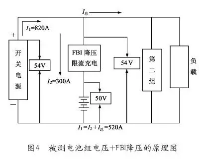 所謂“蓄電池組全在線容量試驗(yàn)”,是指在被測(cè)電池組和通信設(shè)備工作電源之間串聯(lián)一套“電池組全在線放電安全節(jié)能維護(hù)系統(tǒng)FBI”,讓被測(cè)電池組相對(duì)另一組處于浮充狀態(tài)的電池組具有略高電位的趨勢(shì),并通過(guò)FBI系統(tǒng)的控制以使被測(cè)電池組能夠以恒定電流或恒定功率對(duì)在線負(fù)載設(shè)備進(jìn)行供電,隨著被測(cè)電池組電壓的下降,FBI系統(tǒng)自動(dòng)實(shí)時(shí)升壓補(bǔ)償,以保持被測(cè)電池組所在支路電壓(被測(cè)電池組電壓+FBI升壓)始終保持與另一組電池等電位,但始終具有略高電位的趨勢(shì),以使被測(cè)電池組能夠持續(xù)在線供電,當(dāng)被測(cè)電池組以恒定電流或恒定功率在線放電到預(yù)先設(shè)定的截止電壓后,FBI系統(tǒng)自動(dòng)引導(dǎo)整流器在線對(duì)被測(cè)電池組充電恢復(fù),隨著被測(cè)電池組電壓的上升,FBI系統(tǒng)自動(dòng)隨時(shí)降壓補(bǔ)償,以保持被測(cè)電池組所在支路電壓(被測(cè)電池組電壓+FBI升壓)始終保持與另一組電池等電位,直至被測(cè)電池組充電恢復(fù)完成。在此被測(cè)電池組全在線放電和充電過(guò)程中,另一組電池始終保持浮充狀態(tài)。采用FBI,徹底改變了以往蓄電池放電容量測(cè)試模式,解決了離線式測(cè)量法和在線式測(cè)量法的種種弊端。被測(cè)電池組電壓+FBI升壓的原理圖如圖3所示。當(dāng)然也可以采用被測(cè)電池組電壓+FBI降壓的模式。被測(cè)電池組電壓+FBI降壓的原理圖如圖4所示。