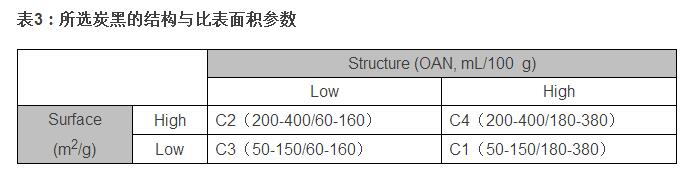 基于以上試驗(yàn)結(jié)果,我們發(fā)現(xiàn)比表面積能夠影響電池的充電接受能力與水損耗值,而結(jié)構(gòu)是炭黑的最要參數(shù),因此在接下來的實(shí)驗(yàn)中我們選取了幾種不同結(jié)構(gòu)與比表面積的炭黑材料,探討炭黑結(jié)構(gòu)與比表面積對電池性能的影響,選取的炭黑參數(shù)如下: