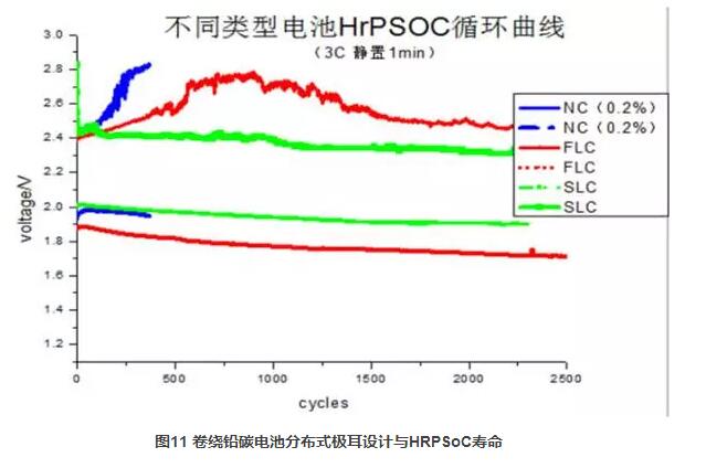 在高碳的應(yīng)用主要體現(xiàn)在80倍率卷繞電池中,基于多年鉛碳電池配方的研究基礎(chǔ),選用了獨(dú)特的碳添加劑與最優(yōu)的添加量,能夠最大程度地提高電池的充電接受能力與循環(huán)壽命,有效避免負(fù)極表面發(fā)脬、疏松。如圖12,這款80倍率卷繞電池在結(jié)構(gòu)設(shè)計(jì)上,采用分布式板耳與TMF超薄極板技術(shù),對于部分客戶采用全板耳的結(jié)構(gòu)設(shè)計(jì),使電流的輸出分配更加合理,并且增加了極板的反應(yīng)面積。普通電池(編號(hào)NC)的HRPSoC壽命充電電壓很快達(dá)到上限,普通的鉛碳電池(編號(hào)FLC)壽命在普通電池的基礎(chǔ)上提高了4-5倍,但是由于充電接受能力不夠理想達(dá)到了電壓下限,而優(yōu)化設(shè)計(jì)后的卷繞鉛碳電池(編號(hào)SLC)在普通鉛碳電池壽命結(jié)束終止時(shí)電壓仍在1.9V以上。