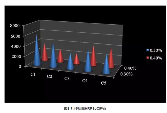 對于HRPSoC壽命(圖8),在0.3%與0.4%添加量下高結(jié)構(gòu)的炭黑(C1與C4)在選取的幾種炭黑中有利于電池的HRPSoC壽命。