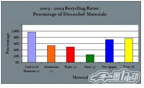 美國環(huán)保署(EPA)、美國鋁業(yè)協(xié)會(Aluminum Association)、美國林業(yè)及紙業(yè)協(xié)會(American Forest and Paper Association)、橡膠制造協(xié)會(Rubber Manufacturing Association)和美國廢物循環(huán)利用協(xié)會(Institute of Scrap Recycling Industries)等組織發(fā)布的數(shù)據(jù)顯示,2004年至2009年之間,美國鉛酸電池回收率達97%,遠高于鋁、紙張、玻璃、報紙和輪胎等物質(zhì)的回收率。(見下圖)