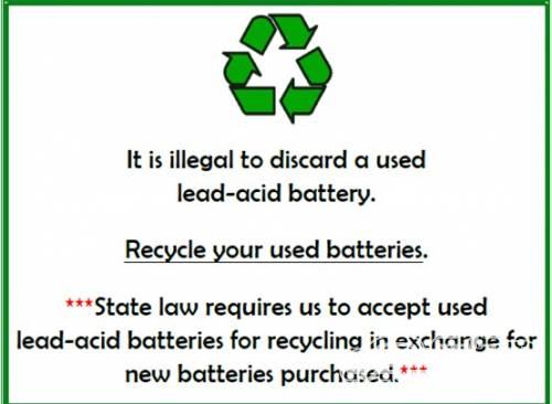 (標志內(nèi)容:隨意丟棄廢舊鉛酸電池是違法行為,應(yīng)對鉛酸電池進行回收。州法律規(guī)定,消費者購買新鉛酸電池時,須用舊電池交換,電池零售商負責(zé)回收舊電池)