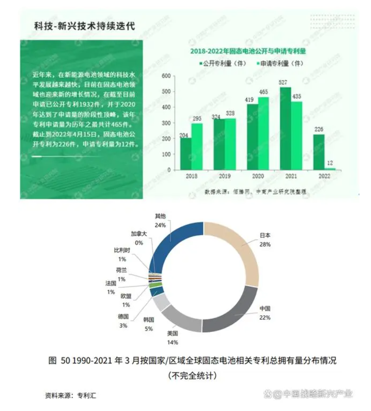 新能源電池領(lǐng)域的科技水平發(fā)展越來越快,目前在固態(tài)電池領(lǐng)域也迎來新的增長情況,申請已公開專利1932件,并于2020年達到了申請量的階段性頂峰,該年專利申請量為歷年之最共計465件。截止2022年4月15日,固態(tài)電池公開專利為226件,申請專利量為12件。