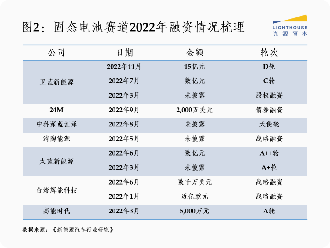 2022年以來,面對(duì)廣闊的發(fā)展前景,PE/VC 資金密集流向固態(tài)電池賽道,鋰礦、動(dòng)力電池、車企等產(chǎn)業(yè)鏈各環(huán)節(jié)的上市公司更是加快了對(duì)固態(tài)電池的布局,市場(chǎng)整體看好固態(tài)電池企業(yè)的未來發(fā)展。