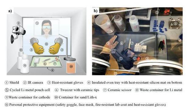 解剖電池需要在專用的安全箱內(nèi)進(jìn)行,箱子的外壁應(yīng)該能在電池發(fā)生安全問(wèn)題時(shí)有效的保護(hù)操作人員,同時(shí)最好能夠配備紅外相機(jī),以在電池發(fā)生短路等問(wèn)題時(shí)能夠及時(shí)發(fā)現(xiàn)。解剖的時(shí)候需要采用隔熱手套,并在箱子內(nèi)部鋪上一層硅膠墊,收集電池在解剖過(guò)程中散落的金屬鋰粉末,同時(shí)操作人員還需要穿戴防火服等個(gè)人防護(hù)設(shè)備。解剖過(guò)程中散落的金屬鋰粉末活性較高,因此需要收集在一起用礦物油浸泡保護(hù),然后進(jìn)行處理。