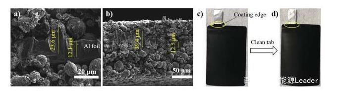 電極在沖切的過(guò)程中容易在邊緣產(chǎn)生顆粒和毛刺,特別是對(duì)于疊片式結(jié)構(gòu)由于邊緣較多,因此由此造成的短路風(fēng)險(xiǎn)會(huì)大大增加,因此需要特別注意電極邊緣位置的清理。下圖a為一個(gè)沖切電極邊緣的Al毛刺,可以看到毛刺的長(zhǎng)度達(dá)到了Al箔厚度的2倍,而如果刀比較鈍的情況下毛刺的長(zhǎng)度可達(dá)Al箔厚度的3倍(如下圖b所示)。如果在電池循環(huán)過(guò)程中電極邊緣的壓力比較大有可能導(dǎo)致毛刺穿透隔膜引起正負(fù)極短路,因此在電極制備的過(guò)程中需要經(jīng)常檢查切刀的狀態(tài)和極片毛刺狀態(tài)。