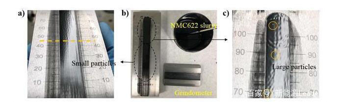 勻漿和涂布過(guò)程是金屬鋰二次電池生產(chǎn)的核心步驟,勻漿和涂布過(guò)程中常見的問(wèn)題是顆粒團(tuán)聚(如下圖所示),部分大的團(tuán)聚顆粒的尺寸可達(dá)100um以上,這在電池中有可能會(huì)對(duì)隔膜構(gòu)成壓力,如果負(fù)極的金屬鋰粉末也在此處團(tuán)聚,會(huì)大大增加短路的風(fēng)險(xiǎn)。