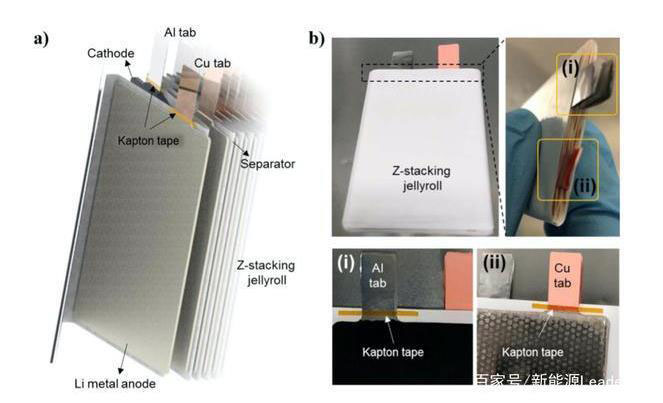 雖然目前還沒(méi)有針對(duì)金屬鋰二次電池的隔膜,但是隔膜對(duì)于提升金屬鋰二次電池的安全性仍然具有重要的影響,通常而言濕法PE隔膜在橫向和縱向上都具有更好的機(jī)械強(qiáng)度,因此相比于干法拉伸隔膜能夠更好的抵抗金屬Li粉末團(tuán)聚的影響。但是PE隔膜的耐熱性比較差,因此通常需要在其表面增加一層陶瓷涂層,從而提升其熱穩(wěn)定性。同時(shí)作者建議在極耳的位置增加一個(gè)極耳固定膠帶(如下圖所示),從而減少正負(fù)極錯(cuò)位的風(fēng)險(xiǎn)。