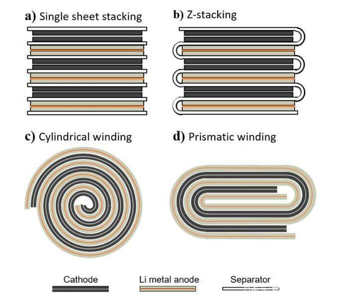 下圖為幾種常見的電池結(jié)構(gòu)示意圖,對(duì)于單層疊片式設(shè)計(jì)由于電極的四周并沒(méi)有完全封閉,因此可能由于邊緣析鋰等問(wèn)題導(dǎo)致電池短路的風(fēng)險(xiǎn)增加。Z字形疊片設(shè)計(jì)的電芯只有上下兩個(gè)方向上是開放的,因此從邊緣發(fā)生短路的風(fēng)險(xiǎn)降低,但是需要注意的是金屬Li與隔膜之間應(yīng)保持足夠的距離,減少短路的風(fēng)險(xiǎn),卷繞式的電芯由于內(nèi)部具有一定的壓力,因此循環(huán)過(guò)程中容易引起電芯變形。