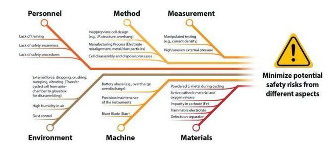 下圖為可能引起鋰離子電池安全問(wèn)題的主要風(fēng)險(xiǎn)點(diǎn):1)人的因素;2)設(shè)計(jì)生產(chǎn)因素;3)材料因素;4)方法因素;5)測(cè)試因素;6環(huán)境因素,例如人的因素就包含了:人員缺乏訓(xùn)練,缺乏安全意識(shí),缺乏安全預(yù)案等幾類問(wèn)題。設(shè)計(jì)生產(chǎn)因素包含:不恰當(dāng)?shù)脑O(shè)計(jì)(卷心結(jié)構(gòu)、電極比例),生產(chǎn)過(guò)程控制(電極偏移、多余物等),電池解剖和廢棄處理過(guò)程。測(cè)試因素:不恰當(dāng)?shù)臏y(cè)試制度(電流密度),過(guò)大/不均勻的壓力。環(huán)境因素:主要包含循環(huán)后的電池在搬運(yùn)過(guò)程中的跌落、碰撞、沖擊、震動(dòng)等因素,空氣濕度過(guò)大,粉塵控制等。機(jī)械因素:電池濫用(過(guò)充、過(guò)放),測(cè)試設(shè)備精度問(wèn)題,保養(yǎng)問(wèn)題。材料因素:金屬鋰在循環(huán)過(guò)程中的粉化,活性材料分解,釋放O2,正極的Fe雜質(zhì),電解液燃燒,隔膜缺陷。