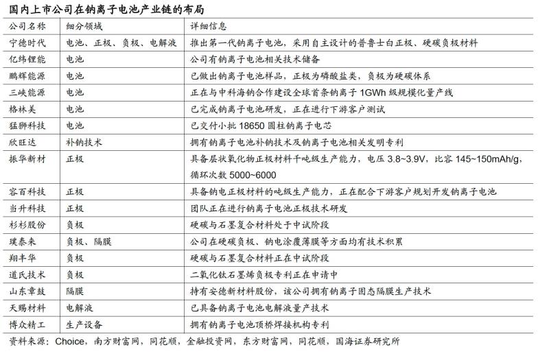 正極材料方面,振華新材(688707.SH)已具備層狀氧化物材料千噸級(jí)生產(chǎn)能力;容百科技(688005.SH)也已具備納電正極噸級(jí)生產(chǎn)能力,正在配合下游客戶規(guī)劃開發(fā)的鈉離子電池。負(fù)極材料方面,杉杉股份(600884.SH)的硬碳石墨復(fù)合材料已進(jìn)入中試階段;璞泰來(603659.SH)在硬碳負(fù)極、鈉電涂覆薄膜等方面均有技術(shù)積累。