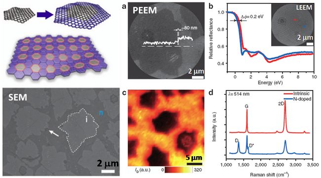 石墨烯在光電技術(shù)等領(lǐng)域有潛在的重要應(yīng)用,而構(gòu)建P-N結(jié)是實現(xiàn)許多光電器件應(yīng)用的核心,因此構(gòu)建石墨烯的光電功能器件必須在保證石墨烯質(zhì)量的前提下,實現(xiàn)高可控性和均一性的穩(wěn)定摻雜。北京大學(xué)化學(xué)與分子工程學(xué)院劉忠范-彭海琳課題組根據(jù)材料生長中調(diào)制摻雜的原理,提出了具有高遷移率、摻雜區(qū)域可控的石墨烯的調(diào)制摻雜生長方法,實現(xiàn)了“馬賽克”結(jié)構(gòu)的石墨烯P-N結(jié)材料的規(guī)模制備,并將其用于高性能光電轉(zhuǎn)換器件。由于對石墨烯進行氮攙雜能夠有效降低表面功函數(shù),其與本征石墨烯區(qū)域在PEEM成像中具有較大的襯度差異,因此PEEM可以作為一個有效的表面研究方法表征具有此類結(jié)構(gòu)的石墨烯表面。