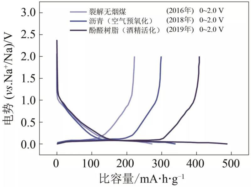 為了獲得比容量更高的下一代碳類負極,作者團隊深入研究了無定形碳的儲Na機理,并基于對機理的理解,通過多種方式調(diào)控了碳的微結(jié)構(gòu),進一步提升了碳類材料的比容量。瀝青是一種價格低廉的石油工業(yè)殘渣,在公路鋪設(shè)、房屋修補等方面有廣泛使用,但按照傳統(tǒng)高溫處理法制備的樣品可逆比容量不足100 mA·h/g。作者團隊通過簡單的在空氣中低溫預(yù)氧化和在惰性氣氛中高溫碳化的方法,可以將可逆比容量提高到約300 mA·h/g。預(yù)氧化過程中引入了含氧官能團,以抑制瀝青高溫結(jié)構(gòu)有序重排,從而達到提升微結(jié)構(gòu)無序度進而提升儲鈉容量的目的。進一步地,作者團隊利用酚醛樹脂(塑料、加工行業(yè)常用原材料,也稱電木)作為前驅(qū)體、乙醇作為造孔劑,通過形成閉合孔隙的策略來精確調(diào)控硬碳微觀結(jié)構(gòu),得到的硬碳負極可逆比容量約為410 mA·h/g,甚至超過了石墨的儲鋰容量。以上3代碳類負極材料的首周充放電曲線如圖3所示。