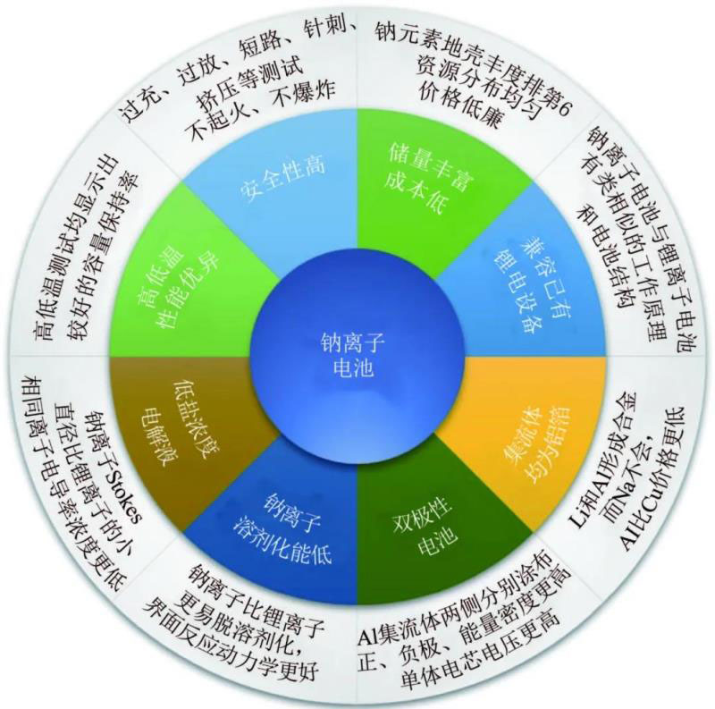 鈉離子電池的優(yōu)勢大致有以下幾個方面:①鈉資源儲量豐富,分布均勻,成本低廉;②鈉離子電池與鋰離子電池的工作原理相似,與鋰離子電池的生產(chǎn)設(shè)備大多可兼容;③由于鋁和鈉在低電位不會發(fā)生合金化反應(yīng),鈉離子電池正極和負極的集流體都可使用廉價的鋁箔;④在固態(tài)電池中,可設(shè)計雙極性電極,在同一張鋁箔兩側(cè)分別涂布正極和負極材料,將這樣的極片周期堆疊,在一個單體電池中實現(xiàn)更高電壓,并可節(jié)約其他非活性材料以提高體積能量密度;⑤鈉離子的溶劑化能比鋰離子更低,即具有更好的界面離子擴散能力;⑥鈉離子的斯托克斯直徑比鋰離子的小,相同濃度的電解液具有比鋰鹽電解液更高的離子電導(dǎo)率,或者更低濃度電解液可以達到同樣離子電導(dǎo)率;⑦根據(jù)目前初步的高低溫測試結(jié)果,鈉離子電池高低溫性能更優(yōu)異;⑧在所有安全項目測試中,均未發(fā)現(xiàn)起火現(xiàn)象,安全性能更好。鈉離子電池的內(nèi)阻相比鋰離子電池要稍微高一點,致使在短路等安全性試驗中瞬間發(fā)熱量少、溫升較低,這是安全性能好的原因之一。更多鈉離子電池特有的優(yōu)勢還會隨著研究的深入逐漸顯示出來,挖掘這些特有優(yōu)勢將提高鈉離子電池產(chǎn)品差異化,使其在未來市場競爭中占據(jù)有利地位。