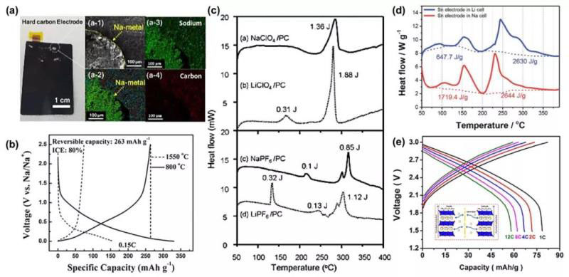 圖3(a)拆解滿充態(tài)Na [Ni0.6Co0.2Mn0.2]O2/硬碳全電池中收集的硬碳電極的光學(xué)照片以及相應(yīng)的SEM、EDS圖像。(b)半電池中800度熱解瀝青碳和1550度熱解瀝青碳的首周充放電曲線。(c)放電態(tài)硬碳電極與EC/DMC溶液混合的DSC曲線,該溶液包含1 M NaClO4,LiClO4,NaPF6或LiPF6。(d)三個(gè)循環(huán)后的鋰化(使用LiPF6鹽)和鈉化Sn電極(使用NaPF6鹽)的DSC曲線。(e)對(duì)稱型Na0.6Cr0.6Ti0.4O2/ Na0.6Cr0.6Ti0.4O2鈉離子全電池在不同倍率下的充放電曲線。