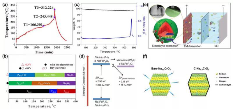 圖2(a)ARC熱穩(wěn)定性測(cè)試滿充NaNi1/3Fe1/3Mn1/3O2/硬碳電池的溫度與時(shí)間的關(guān)系圖。(b)滿充態(tài)NaNi1/3Fe1/3Mn1/3O2在不同條件下取決于溫度的熱分解過程示意圖。(c)脫鈉態(tài)NaFeP2O7的熱分析(TG-DSC)曲線。(d)Na2-xFeP2O7多晶型的對(duì)應(yīng)焓圖。(e)正極-電解質(zhì)界面化學(xué)引起的電池失效機(jī)理示意圖。(f)高溫下脫鈉態(tài)Na0.5CrO2的熱反應(yīng)機(jī)理。