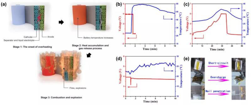 圖1(a)熱失控過程的三個(gè)階段。(b-e)滿充狀態(tài)下(Na0.9[Cu0.22Fe0.30Mn0.48] O2 /熱解無煙煤)鈉離子電池軟包的安全性測(cè)試結(jié)果。(b)外部短路測(cè)試,(c)過充電測(cè)試和(d)針刺測(cè)試過程中的電壓和溫度變化,(e)安全測(cè)試前后的軟包電池照片。