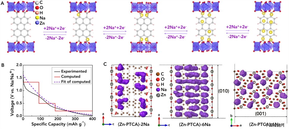 鈉離子在Zn-PTCA中的嵌入位點(A)、嵌入電壓(B)以及遷移通道(C)