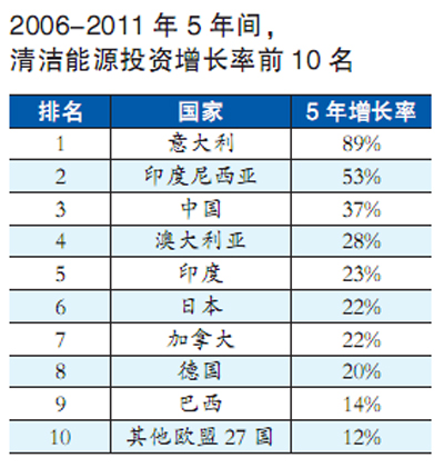 在20國集團(tuán)中,印度清潔能源增速驚人,其清潔能源投資上漲54%,達(dá)到102億美元,這主要是由于印度推行的“國家太陽能使命”項目,該項目計劃到2020年將印度國內(nèi)太陽能裝機(jī)容量增至20吉瓦。日本清潔能源投資額較2010年上漲23%,至86億美元,預(yù)計未來日本對清潔能源的投資將進(jìn)一步加大。