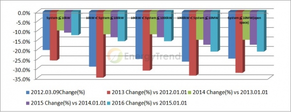 首先從補(bǔ)助金額下修來看,2012年3月9日的調(diào)整相較于2012年1月1日而言,下修幅度在20%至30%,其中屋頂系統(tǒng)調(diào)整幅度最大集中在10kW至10MW等中大型光伏系統(tǒng)上,而地面型光伏系統(tǒng)小于10MW的部分調(diào)整幅度約25%;除此之外,自2012年5月1日起補(bǔ)助金額將按月固定下調(diào)0.15歐元/kWh。