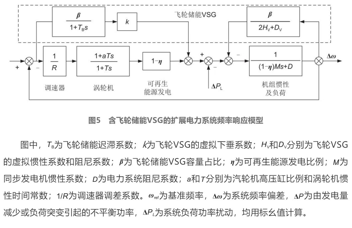 傳統(tǒng)電力系統(tǒng)頻率響應(yīng)模型(SFR)由調(diào)速器、原動(dòng)機(jī)、同步發(fā)電機(jī)組和負(fù)載組成,模型建立過(guò)程中對(duì)其進(jìn)行等效處理和合理簡(jiǎn)化??稍偕茉幢壤粩嗌叩碾娏ο到y(tǒng)中,可再生能源發(fā)電比例的增加通過(guò)關(guān)閉傳統(tǒng)同步發(fā)電機(jī)組來(lái)實(shí)現(xiàn)。假設(shè)可再生能源不參與一次調(diào)頻也不提供慣性,在SFR模型的基礎(chǔ)上,引入可再生能源發(fā)電比例的變量圖片,得到含可再生能源的電力系統(tǒng)擴(kuò)展頻率響應(yīng)模型。根據(jù)電力系統(tǒng)頻率控制原理,飛輪儲(chǔ)能VSG并網(wǎng)調(diào)頻時(shí)形成功率閉環(huán)和參考頻率雙閉環(huán),對(duì)應(yīng)飛輪儲(chǔ)能VSG的轉(zhuǎn)子運(yùn)動(dòng)方程和虛擬下垂控制過(guò)程,得到含飛輪儲(chǔ)能VSG的擴(kuò)展電力系統(tǒng)頻率響應(yīng)模型如圖5所示。