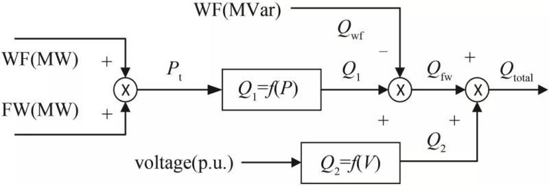 原加拿大Temporal Power公司建于安大略省Clear Creek的5 MW飛輪儲(chǔ)能電站,2016年2月商運(yùn)。該儲(chǔ)能電站主要配合附近的20 MW風(fēng)電場(chǎng)運(yùn)行,可以平滑風(fēng)電出力也可對(duì)風(fēng)電場(chǎng)提供無(wú)功補(bǔ)償。平滑出力時(shí)根據(jù)風(fēng)電實(shí)時(shí)功率和平均功率的偏差作為飛輪的參考出力;如圖3所示,提供無(wú)功補(bǔ)償時(shí),風(fēng)電場(chǎng)所需無(wú)功功率分為Q1、Q2兩部分,Q1與風(fēng)電及飛輪的總有功Pt有關(guān),Q2和電網(wǎng)電壓水平V(p.u.)有關(guān)。首先確定所需無(wú)功功率Q1與風(fēng)電及飛輪的總有功Pt的若干個(gè)基準(zhǔn)關(guān)系點(diǎn),剩余點(diǎn)可通過(guò)插值確定。所需無(wú)功功率Q2和電網(wǎng)電壓水平V(p.u.)的關(guān)系則有死區(qū)的限制,即當(dāng)電網(wǎng)電壓標(biāo)幺值低于或高于某一水平才進(jìn)行無(wú)功補(bǔ)償,Q1、Q2兩部分無(wú)功之和扣除風(fēng)電本身的Qwf后所得Qtotal作為飛輪無(wú)功出力參考值。