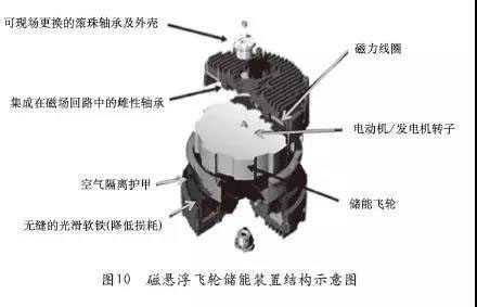磁懸浮飛輪儲能技術(shù)一般是以高速旋轉(zhuǎn)的飛輪鐵芯作為機(jī)械能量的存儲介質(zhì),飛輪等器件都被密封在一個密閉的真空容器內(nèi),以有效地避免空氣阻力的影響,同時為了降低飛輪旋轉(zhuǎn)時的損耗,提高飛輪的轉(zhuǎn)速和儲能的效率,在飛輪儲能裝置內(nèi)使用磁懸浮技術(shù)對飛輪加以控制,并利用電動機(jī)/發(fā)電機(jī)和能量轉(zhuǎn)換控制系統(tǒng)來控制電能的輸入和輸出。圖10即為磁懸浮飛輪儲能裝置的結(jié)構(gòu)示意圖。