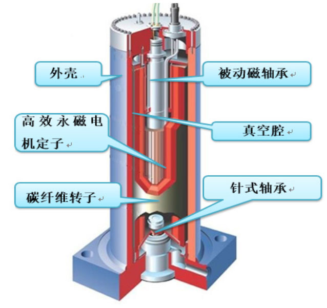 1)被動磁軸承技術(shù):無需電控單元、非接觸、無磨損、免維護(hù)、簡單可靠。