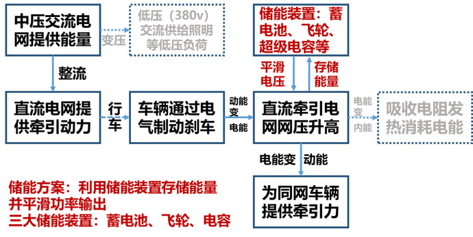 事實(shí)上,目前使用的儲能技術(shù)方案,比起單純地把站臺修高則要復(fù)雜和有效得多,為地鐵系統(tǒng)節(jié)能降耗提供了更多的調(diào)度和使用的靈活性,其能量流轉(zhuǎn)過程如下圖所示,儲能的代表技術(shù)主要有蓄電池儲能、電容儲能、飛輪儲能3種。