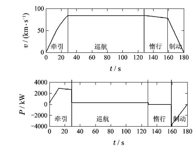 如上圖所示,車輛在站間運(yùn)行時,先經(jīng)歷牽引階段,車輛由靜止開始加速,電機(jī)消耗較大的功率產(chǎn)生牽引力,車速加速至80km/h左右。之后,車輛進(jìn)入等速巡航階段,此時電網(wǎng)只需要提供較小的功率即可維持車輛的巡航,車輛快到站的時候,電網(wǎng)不再提供功率,車輛開始惰行,車速稍有降低,最后車輛進(jìn)入制動階段,車速迅速減至0。