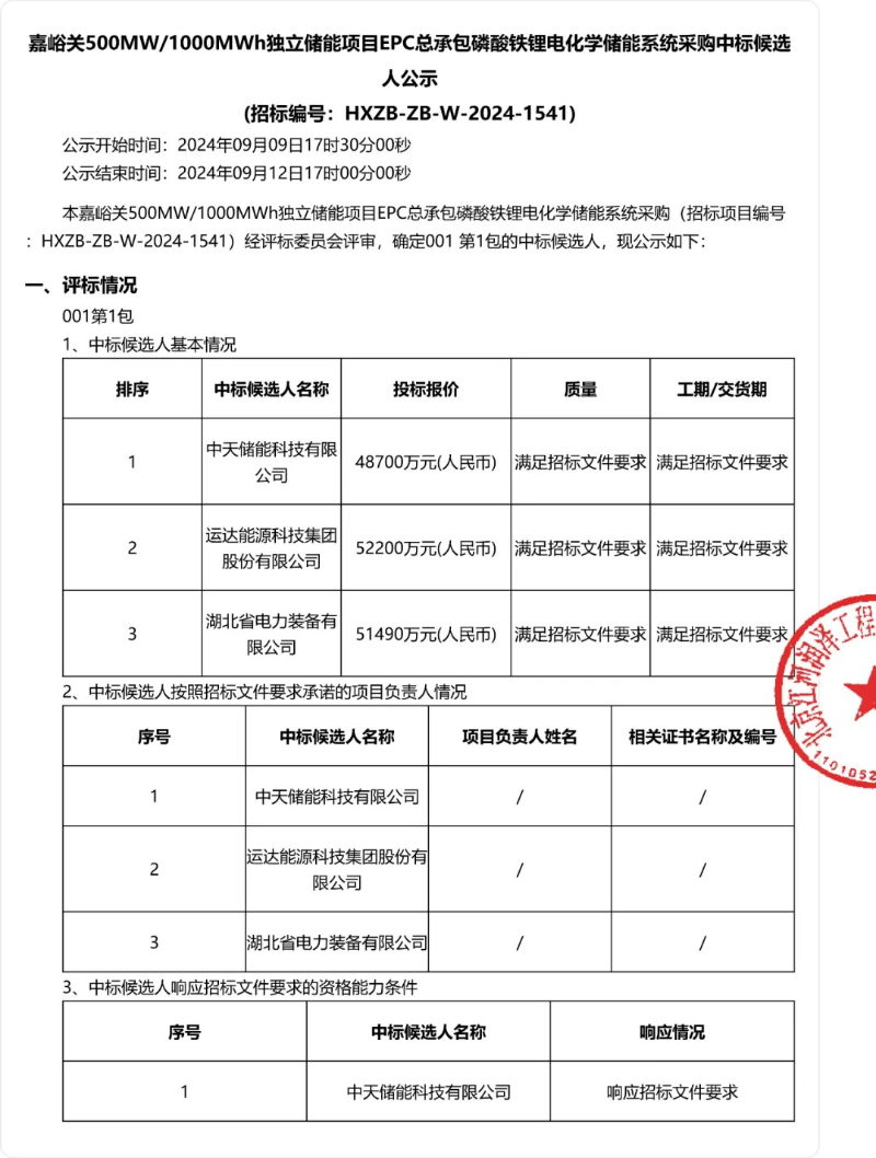 第一中標候選人:中天儲能科技有限公司,投標報價48700萬元,折合單價0.487元/Wh;