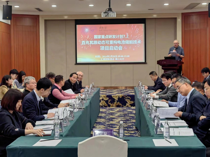 中國儲能網(wǎng)訊:2月28日上午,由清華大學(xué)牽頭、電機(jī)系研究員慈松為項(xiàng)目負(fù)責(zé)人的國家重點(diǎn)研發(fā)計(jì)劃“儲能與智能電網(wǎng)技術(shù)”重點(diǎn)專項(xiàng)“7.2百兆瓦級動(dòng)態(tài)可重構(gòu)電池儲能技術(shù)(共性關(guān)鍵技術(shù))”(2023YFB2407900)項(xiàng)目啟動(dòng)會在北京市順利召開。項(xiàng)目承擔(dān)單位還包括中國科學(xué)院電工研究所、西安交通大學(xué)、北京理工大學(xué)、華電內(nèi)蒙古能源有限公司、國網(wǎng)江蘇省電力有限公司、中國移動(dòng)通信集團(tuán)設(shè)計(jì)院有限公司、云儲新能源科技有限公司、北京索英電氣技術(shù)股份有限公司和合肥國軒高科動(dòng)力能源有限公司,形成由10家國內(nèi)領(lǐng)域內(nèi)優(yōu)勢單位組成的產(chǎn)-學(xué)-研-用、信息-能源交叉融合的聯(lián)合攻關(guān)團(tuán)隊(duì)。