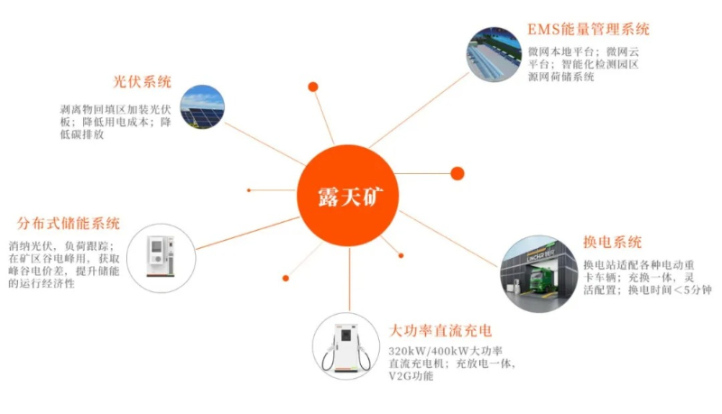 結(jié)合光伏發(fā)電、分布式儲(chǔ)能系統(tǒng)充放電,可滿足園區(qū)電動(dòng)車輛的用電需求,降低電動(dòng)汽車充電成本,打造零碳礦區(qū);通過EMS能量管理系統(tǒng)可實(shí)現(xiàn)光伏+儲(chǔ)能+充電+換電的協(xié)同運(yùn)行,通過消納光伏和負(fù)荷跟蹤,最大化提升系統(tǒng)運(yùn)行的經(jīng)濟(jì)性。