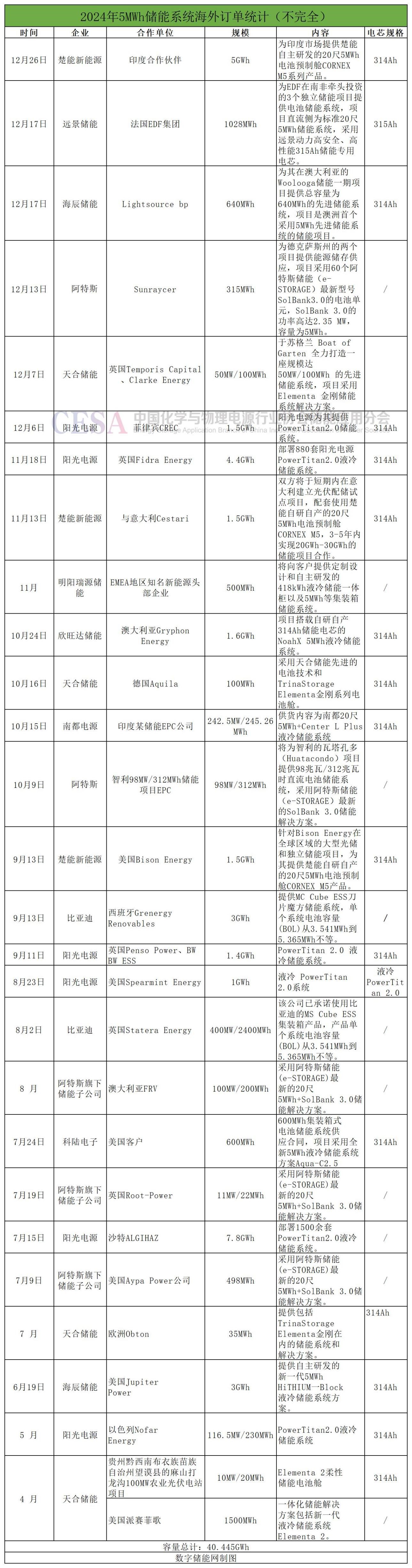 據(jù)中國儲能網(wǎng)不完全統(tǒng)計,2024年,儲能系統(tǒng)廠商出海收獲的涉及5MWh儲能系統(tǒng)訂單超近40.445GWh。