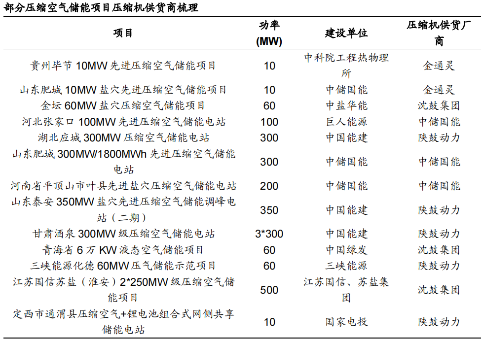 上游為設(shè)備、資源供應(yīng),壓縮空氣儲(chǔ)能關(guān)鍵設(shè)備包括壓縮機(jī)、膨脹機(jī)、儲(chǔ)熱器、換熱器、系統(tǒng)集成與控制設(shè)備等。核心設(shè)備廠家有陜鼓動(dòng)力、沈鼓集團(tuán)、哈爾濱電氣、東方電氣、金通靈、杭氧股份、川空集團(tuán)等。