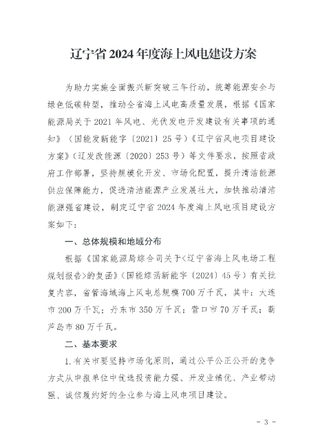 《通知》指出,遼寧2024年省管海域海上風(fēng)電總規(guī)模700萬(wàn)千瓦,其中,大連市200萬(wàn)千瓦;丹東市350萬(wàn)千瓦;營(yíng)口市70萬(wàn)千瓦;葫蘆島市80萬(wàn)千瓦。
