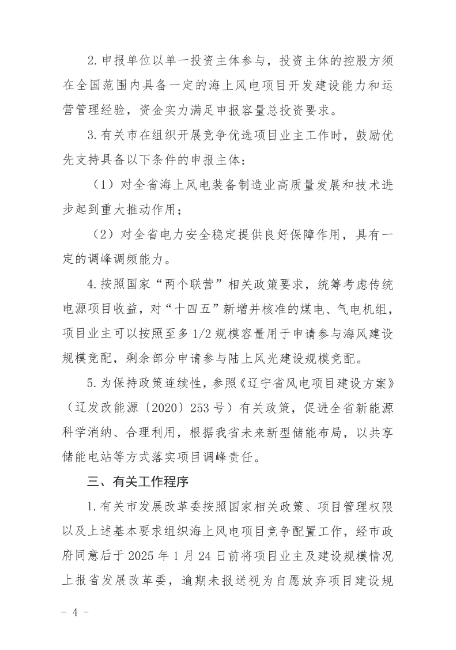 《通知》還指出,項(xiàng)目業(yè)主應(yīng)注重規(guī)模化開發(fā),至少開發(fā)建設(shè)50萬(wàn)千瓦以上規(guī)模海上風(fēng)電項(xiàng)目。注意集約利用海洋資源,優(yōu)化海底送出通道布置。除大連市DL2、DL3項(xiàng)目可以采取單條海底送出通道外,其他區(qū)域每條海底送出通道容量不得低于50萬(wàn)千瓦。《通知》明確,有關(guān)市發(fā)展改革委按照國(guó)家相關(guān)政策、項(xiàng)目管理權(quán)限以及上述基本要求組織海上風(fēng)電項(xiàng)目競(jìng)爭(zhēng)配置工作,經(jīng)市政府同意后于2025年1月24日前將項(xiàng)目業(yè)主及建設(shè)規(guī)模情況上報(bào)省發(fā)展改革委,逾期未報(bào)送視為自愿放棄項(xiàng)目建設(shè)規(guī)模。