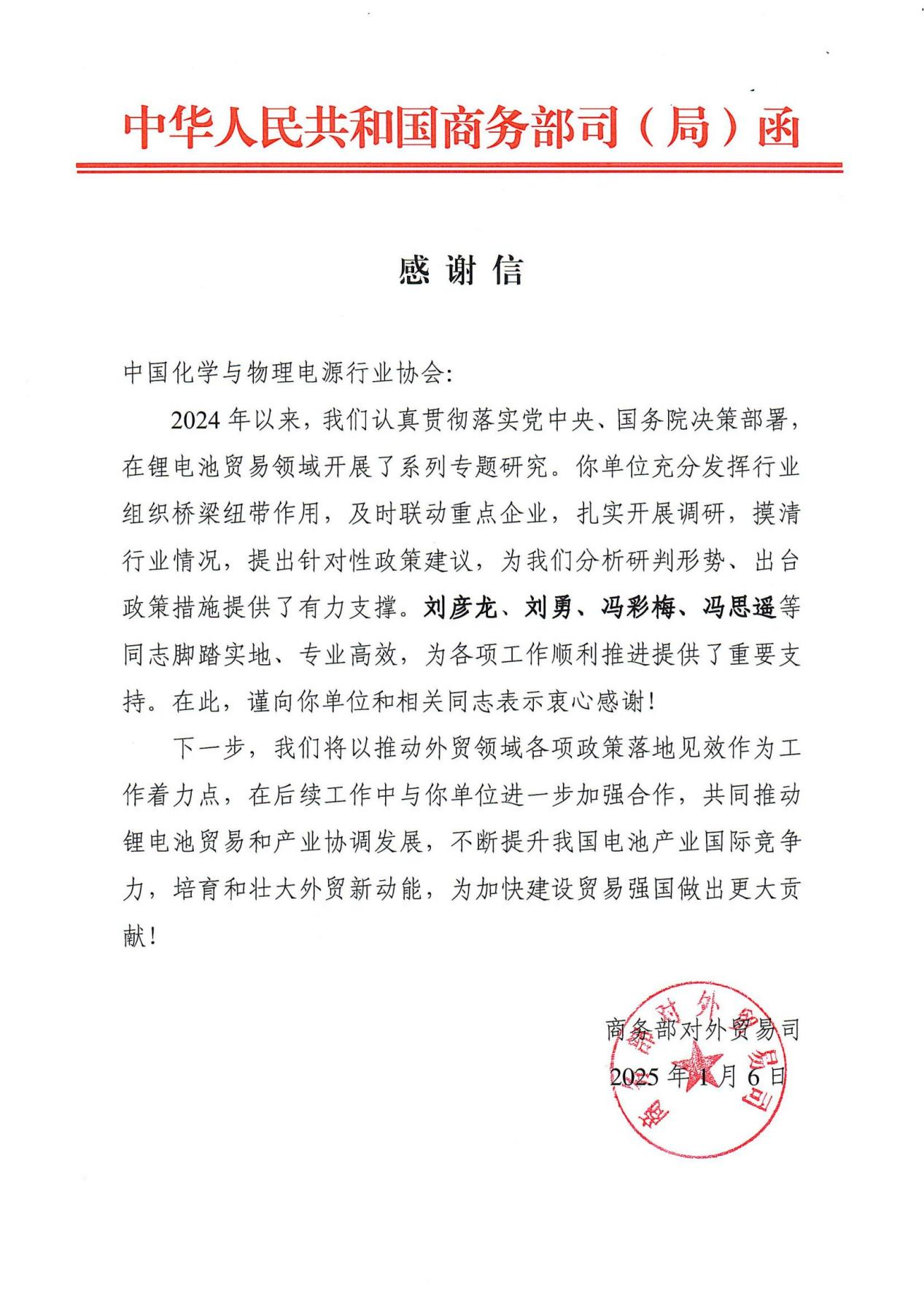 中國儲能網(wǎng)訊:2025年1月6日,商務(wù)部對外貿(mào)易司向我會致感謝信。