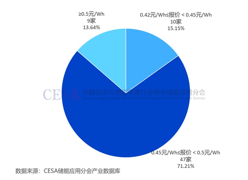 可以看出,僅9家企業(yè)報(bào)價(jià)在0.5元/Wh以上,86.36%的企業(yè)報(bào)價(jià)低于0.5元/Wh,15.15%的企業(yè)投標(biāo)報(bào)價(jià)低于0.45元/Wh,71.21%的企業(yè)報(bào)價(jià)集中在0.45-0.5元/Wh這個(gè)區(qū)間內(nèi)。