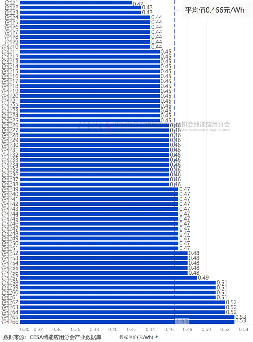 根據(jù)開標(biāo)文件,本次集采共66家企業(yè)參與競(jìng)標(biāo),投標(biāo)報(bào)價(jià)在0.42-0.53元/Wh區(qū)間內(nèi),平均報(bào)價(jià)0.466元/Wh。
