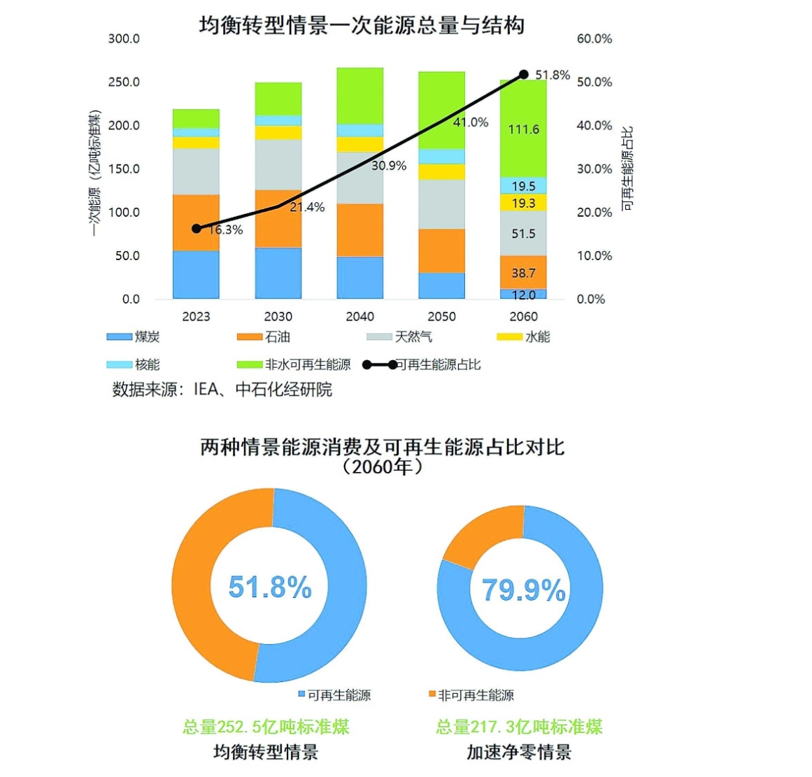 根據(jù)報告,均衡轉(zhuǎn)型情景下,一次能源消費(fèi)將于2045年前達(dá)到峰值267.1億噸標(biāo)準(zhǔn)煤(以發(fā)電煤耗法統(tǒng)計,下同),可再生能源占比逐步上升至2060年的51.8%。能源消費(fèi)增速逐步放緩,到2060年為252.5億噸標(biāo)準(zhǔn)煤,油氣共計占比為35.7%。加速凈零情景則要求能源消費(fèi)達(dá)峰提前到2035年(241.6億噸標(biāo)準(zhǔn)煤)。需要加快可再生能源發(fā)展并形成集約化的能源生產(chǎn)利用方式,到2060年可再生能源占比達(dá)到79.9%,油氣共計占比為10.1%。