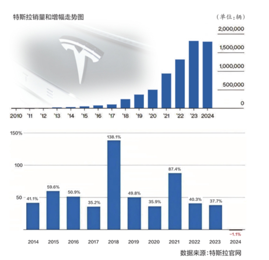 中國(guó)儲(chǔ)能網(wǎng)訊:1月2日,美國(guó)電動(dòng)汽車明星企業(yè)特斯拉公布了其2024年的銷量“成績(jī)單”。過去一年,特斯拉全球銷量為178.9萬輛,同比下降1.1%,低于2023年的181萬輛以及分析師的普遍預(yù)期,這也是特斯拉十多年來年銷量首次出現(xiàn)負(fù)增長(zhǎng)。特斯拉2024年的產(chǎn)量為177.3萬輛,同比下降3.9%。受此影響,當(dāng)日特斯拉美股收跌6.08%。