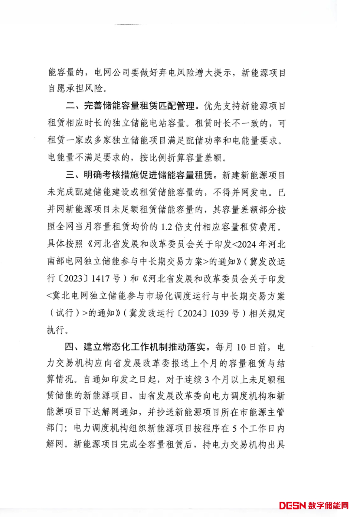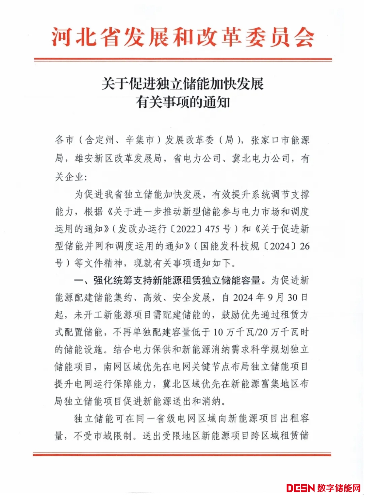 強(qiáng)化統(tǒng)籌支持新能源租賃獨立儲能容量。為促進(jìn)新能源配建儲能集約、高效、安全發(fā)展,自2024年9月30日起,未開工新能源項目需配建儲能的,鼓勵優(yōu)先通過租賃方式配置儲能,不再單獨配建容量低于10萬千瓦/20萬千瓦時的儲能設(shè)施。