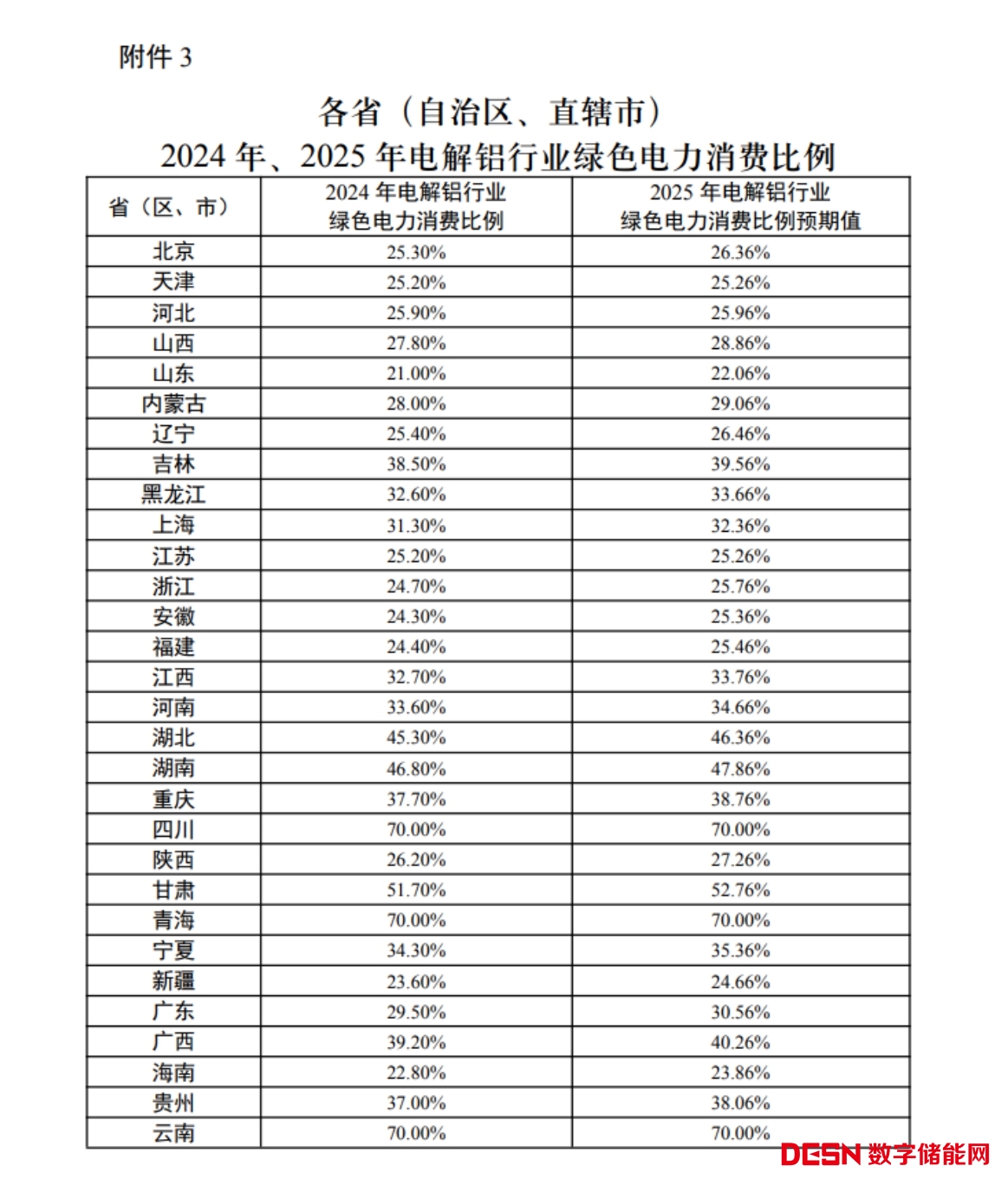 3.各?。ㄗ灾螀^(qū)、直轄市)2024年、2025年電解鋁行業(yè)綠色電力消費比例