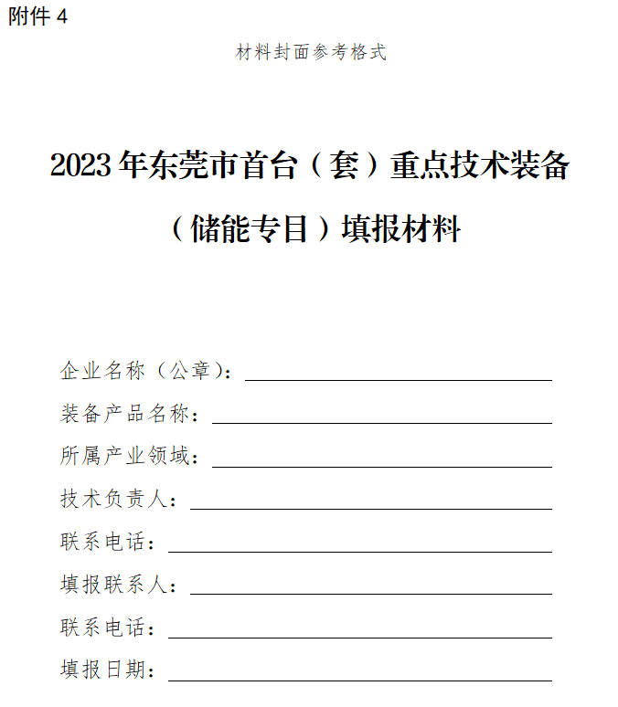 請相關(guān)儲(chǔ)能裝備制造業(yè)企業(yè)按要求認(rèn)真填寫《東莞市首臺(tái)(套)重點(diǎn)技術(shù)裝備(儲(chǔ)能專目)情況表》(見附件2),并將附件2及相關(guān)證明附件裝訂成冊。具體如下:
